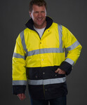 Wind- und wasserdicht, Stehkragen, verstaubare Kapuze mit Kordelzug, gestrickte Ärmelbündchen, Kombi-Verschluss mit durchgehendem Reissverschluss und Druckknöpfen, durchgehende Windschutzblende, 2 Seitentaschen mit Klappen, Brusttasche innen, Nähte versiegelt, zertifiziert nach EN ISO 20471 Klasse 3 und EN 343, garantierte Reflektionseigenschaft gemäss EN-Norm für 25 Waschgänge, 2 Reflexstreifen an Ärmeln, je 1 Reflexstreifen über jeder Schulter, zwei 5cm breite Reflexstreifen um den Körper, 40° waschbar.